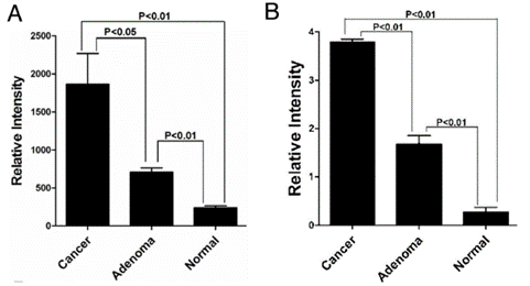 上图:A:芯片检测中CCAL在恶性、良性肿瘤和正常组织的表达量不断降低;B:qRT-PCR验证中CCAL在恶性、良性肿瘤和正常组织的表达量不断降低,与芯片验证结果相符。