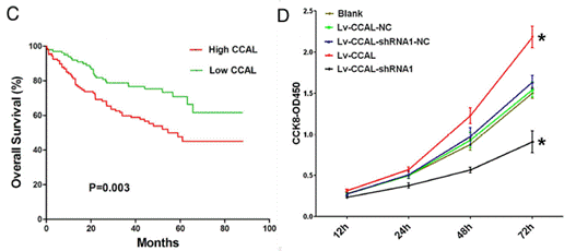 下图:C:K-M曲线显示,CCAL高表达与结直肠癌预后不良显著相关;D:CCK8检测细胞增殖,转染后不同时间点不同处理组比较发现,CCAL显著促进细胞增殖。