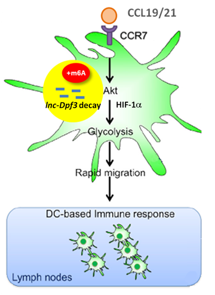 与mRNA类似,m6A修饰可作为 lncRNAs降解或者快速转化的标志。比如, 在对树突状细胞的研究中发现, lncRNA Dpf-3的两个m6A 修饰位点可以导致它的降解及表达的下调 (图 5) [8], 进而解除lncRNA Dpf-3对HIF-1的抑制,最终导致树突状细胞转移至淋巴结,产生免疫应答。而当趋化因子 CCL19/21 激活下游受体 CCR7 , lnc-Dpf3甲基化水平下调,树突状细胞的免疫应答终止。