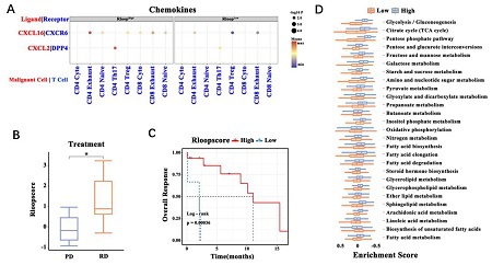 图3:A. 细胞通讯分析表明在R-loop得分与恶性细胞-T细胞亚型间趋化因子水平显著正相关;B. 箱型图显示靶向治疗后PD(疾病进展)样本和RD(完全或部分反应)样本的恶性细胞R-loop得分差异;C. KM曲线显示R-loop评分高和低的患者总生存率的差异。D. GSVA分析显示高和低R-loop评分的恶性细胞之间代谢通路的差异。