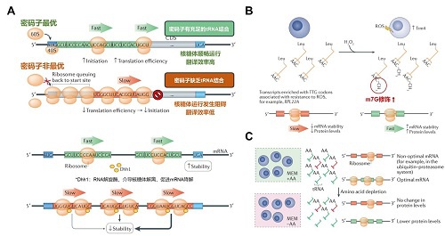 图1. tRNA表达水平(A)、修饰水平(B)、氨基酸负载比例(C)影响mRNA翻译和稳定性