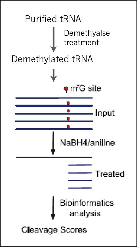 图1. m7G TRAC-Seq实验流程。分离获得的小RNA首先经过去甲基酶处理,以最大限度地减少背景干扰。随后,去甲基化的RNA依次用NaBH₄和苯胺处理,在m7G残基处诱导还原性切割。此过程产生带有可用于连接接头的,在m7G位点断裂的3'末端片段,进行 cDNA 文库构建。最后,通过高通量测序和生物信息学分析,利用跨 tRNA 转录组的裂解评分,实现对 m7G 位点的精确定位。