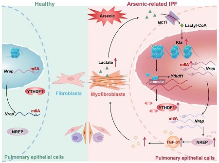 本研究通过质谱检测明确了特发性肺纤维化疾病模型中H3K18la组蛋白乳酸化水平的异常上调,随后通过ChIP-seq实验鉴定H3K18la修饰主要定位于YTHDF1基因的启动子区域、并显著提高了YTHDF1基因的转录水平,从而表达出更多YTHDF1蛋白,使其通过m6A reader作用进一步结合带有m6A修饰的mRNA Nrep、增强了Nrep的mRNA稳定性,最终促进纤维化通路的激活。抑制乳酸生成或敲低YTHDF1均可抑制这一作用、减缓细胞纤维化的进程。总之,H3K18la乳酸化修饰的异常上调在亚砷酸盐相关的肺纤维化病变过程中是关键节点和有前景的治疗靶点,具有重要的研究价值和临床意义。
