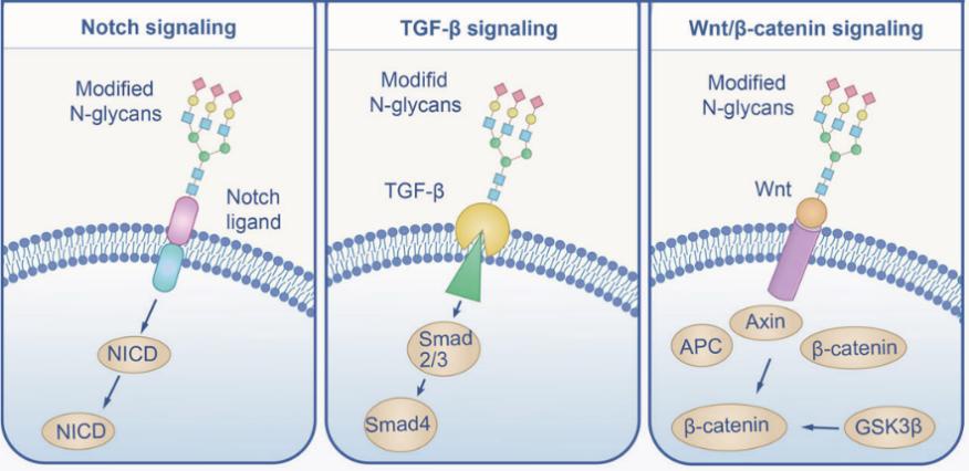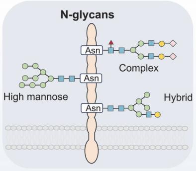 图1.上图:N-糖基化修饰的类型;下图:N-糖基化的功能——影响信号传导[1]
